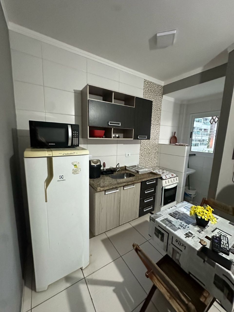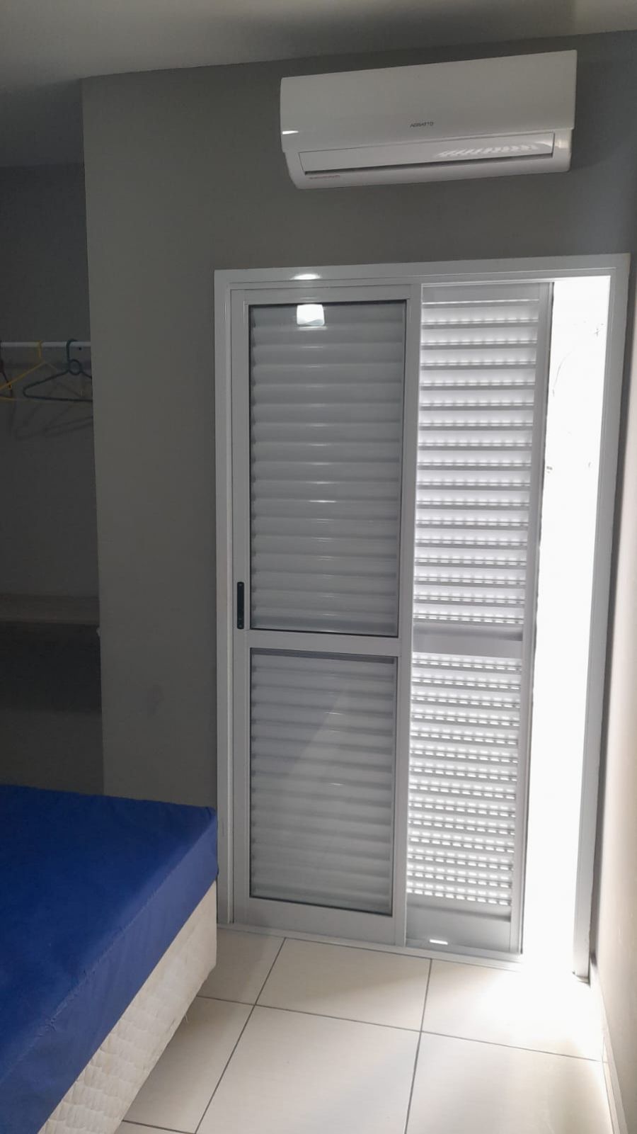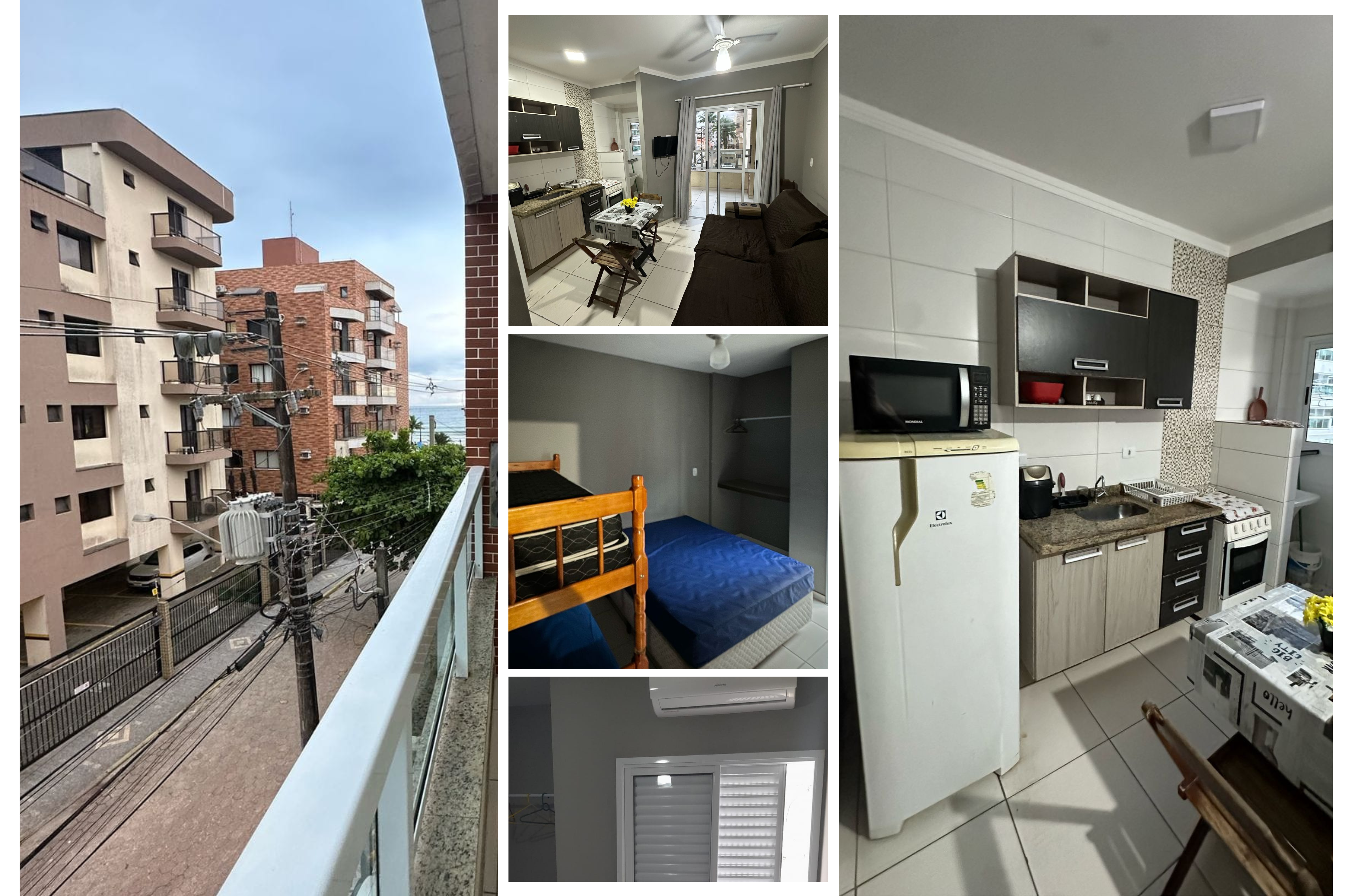 Apartamento de um dormitório com cama de casal, beliche, ventiladores de teto e ar condicionado, cozinha completa, sala, varanda gourmet com churrasqueira. 30 metros da praia, prédio com elevador e zeladora. Check in- 14:00 Check out- 10:00