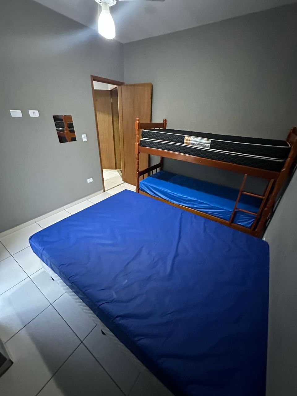 Apartamento de um dormitório com cama de casal, beliche, ventiladores de teto e ar condicionado, cozinha completa, sala, varanda gourmet com churrasqueira. 30 metros da praia, prédio com elevador e zeladora. Check in- 14:00 Check out- 10:00